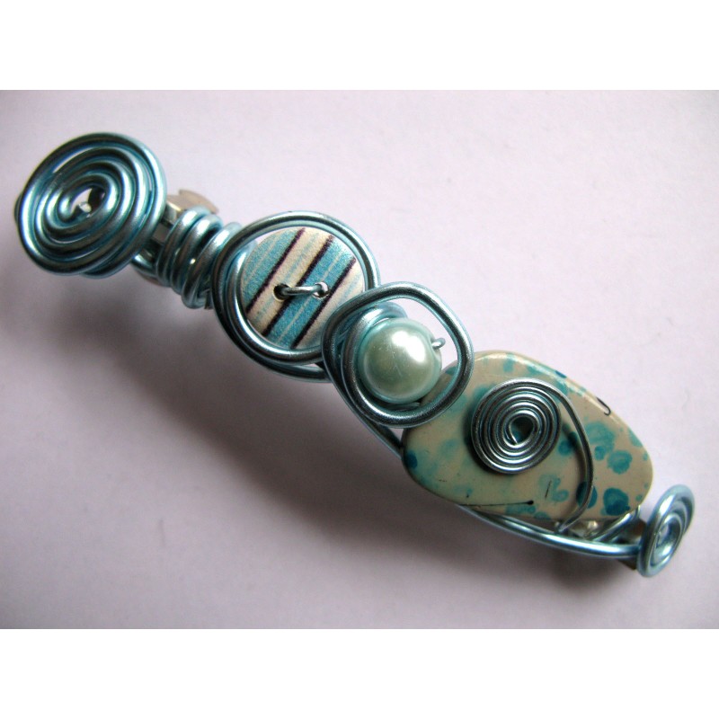 Barrette 100 mm (pour chevelure abondante) décorée de fils alu turquoise, perles acrylique