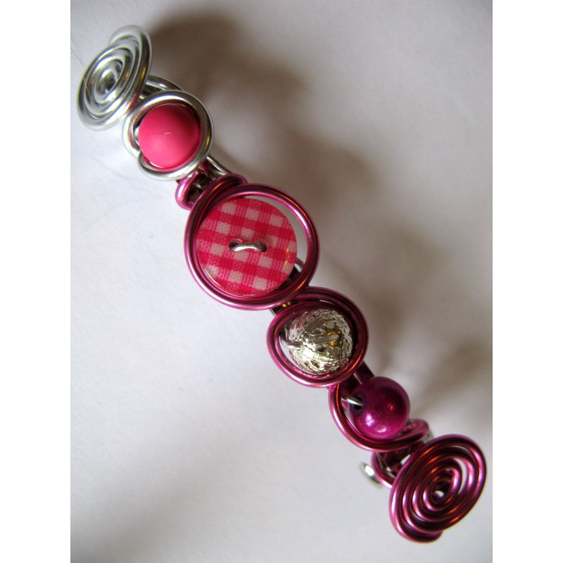 Barrette fuchsia et argent 100mm réalisée avec fil alu fuchsia et argent, perles aux couleurs assorties
