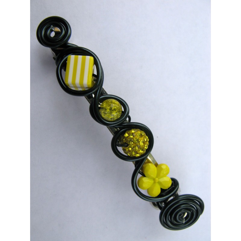 Barrette 100mm réalisée avec fil alu noir, perles aux couleurs jaunes assorties