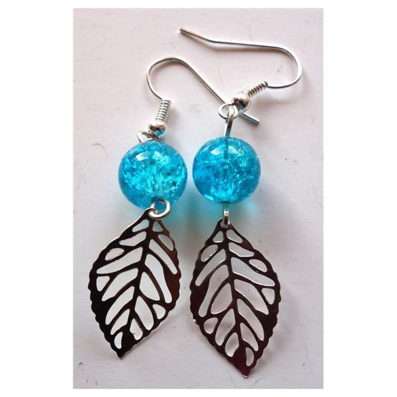 boucles d'oreilles feuilles argentées perles craquelées turquoise