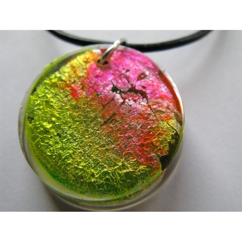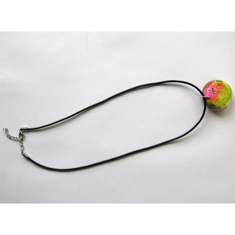 Collier avec pendentif en fimo effet verre rose et jaune de 3 cm de diamètre sur lacet noir