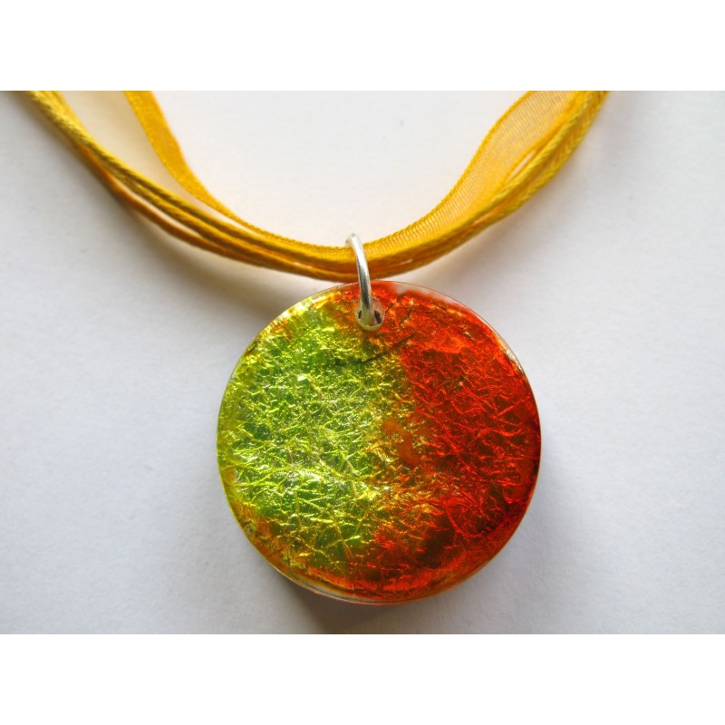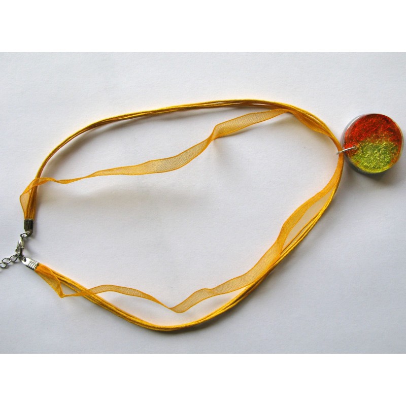 Collier avec pendentif en fimo effet verre jaune orangé de 3 cm de diamètre sur lacet organza orangé