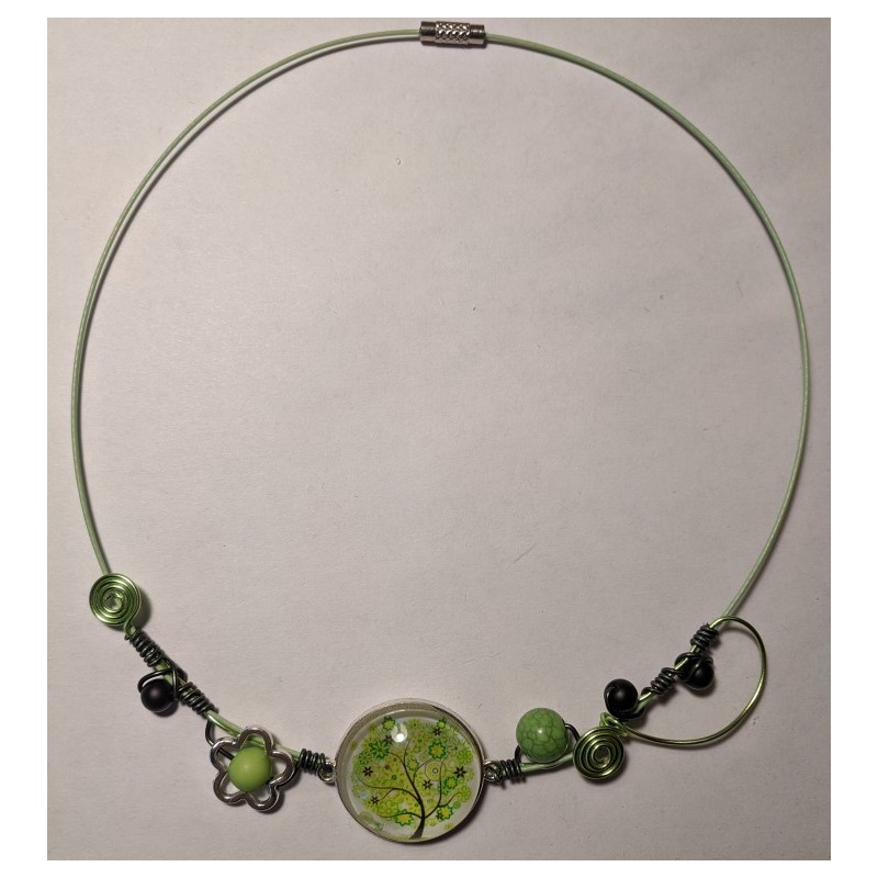 Collier fil alu vert anis et noir avec cabochon 25 mm arbre de vie vert, perles assorties