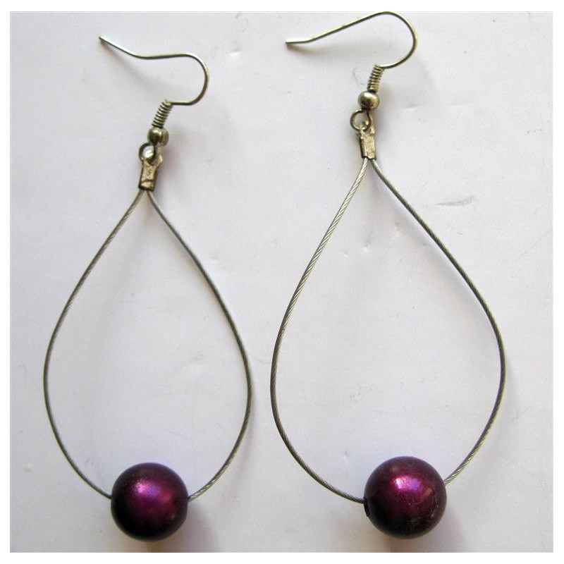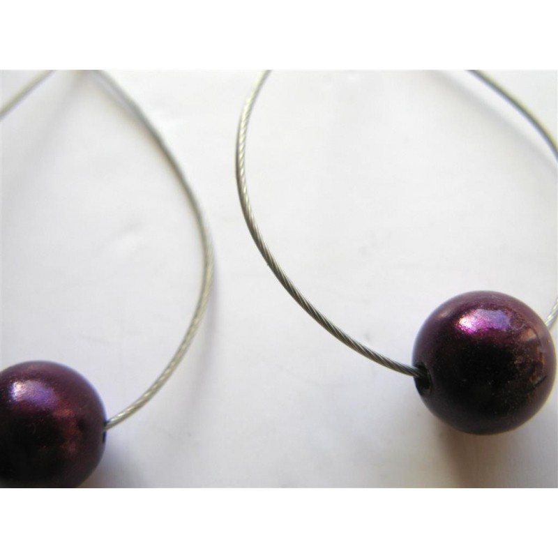 Boucles d'oreilles réalisées avec un fil cable qui retient une perle magique violine aux effets nacrés