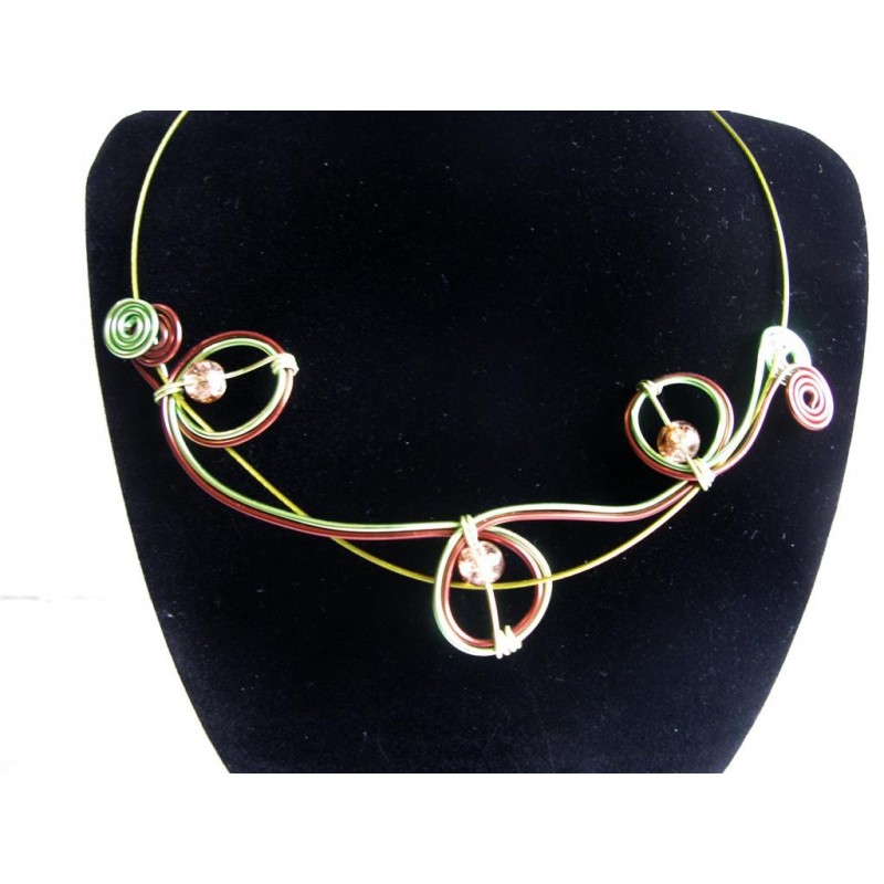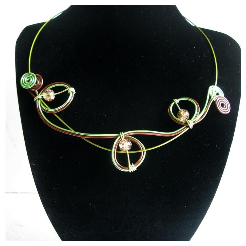 Collier réalisé en fil alu marron et vert et 3 perles craquelées marron