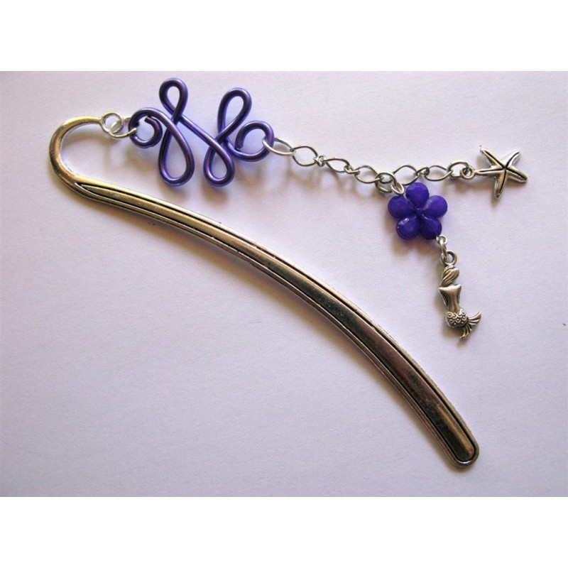 Marque -page réalisé avec tige courbée en alliage de zinc (sans cadmium) couleur argentée (décors gravés selon arrivage) de 12 cm environ, agrémenté de fil alu violet, perle fleur, breloque sirène et étoile de mer