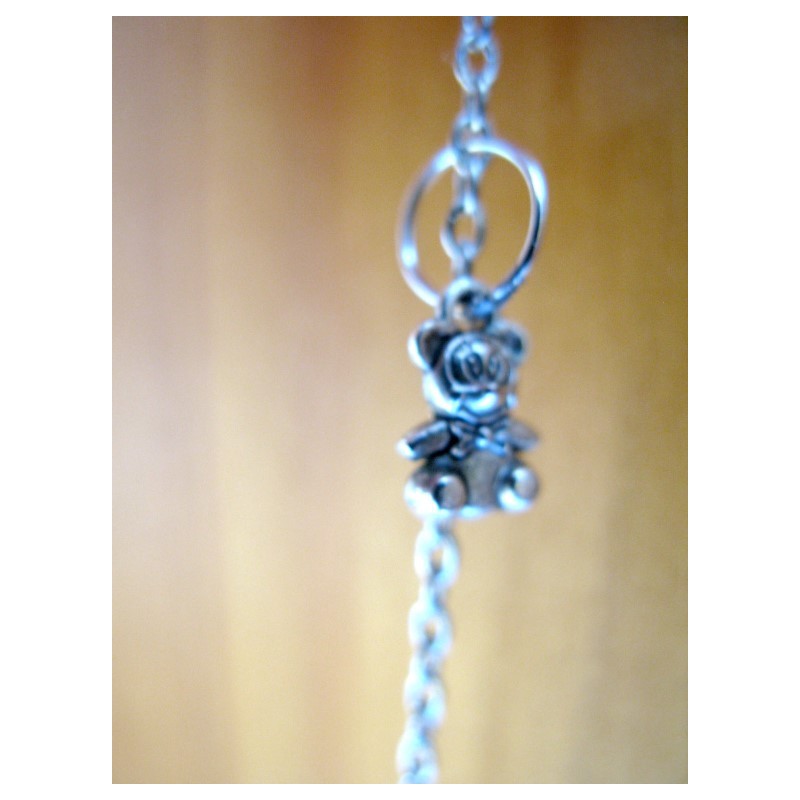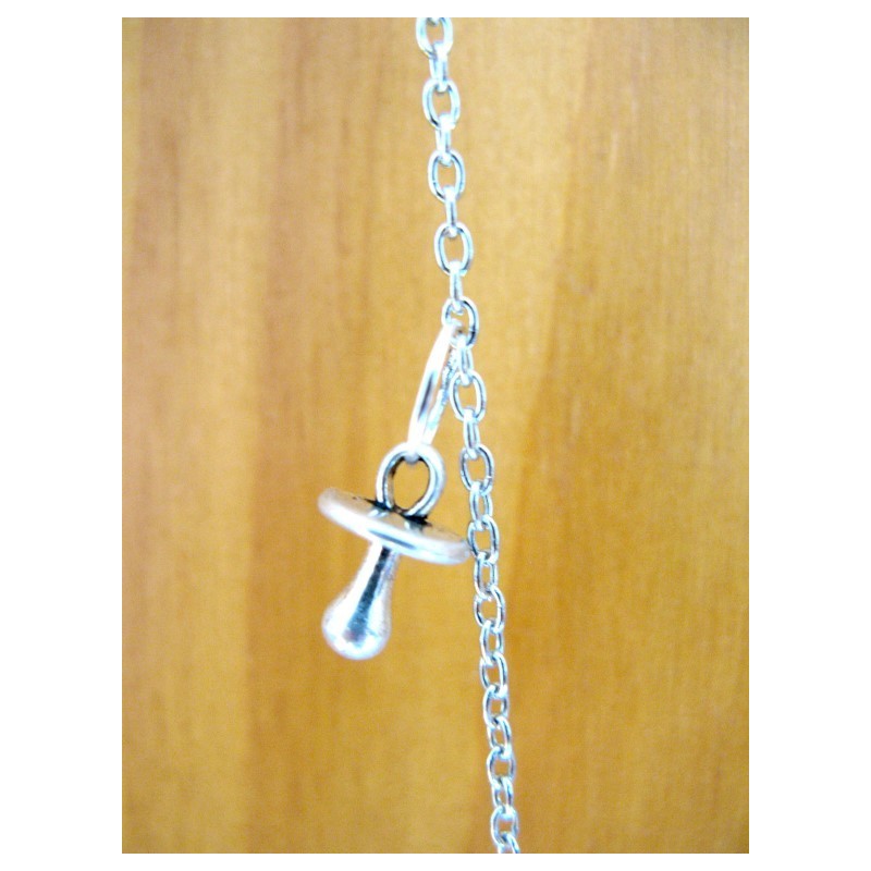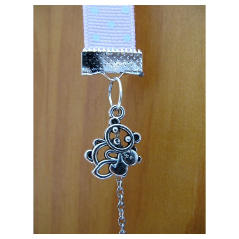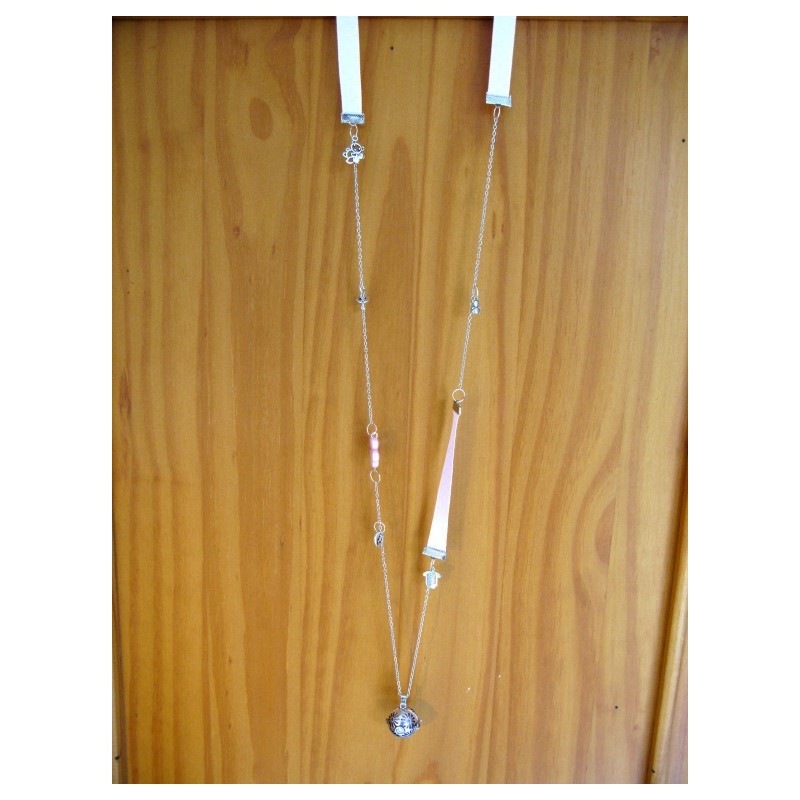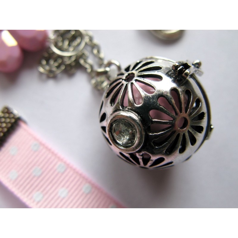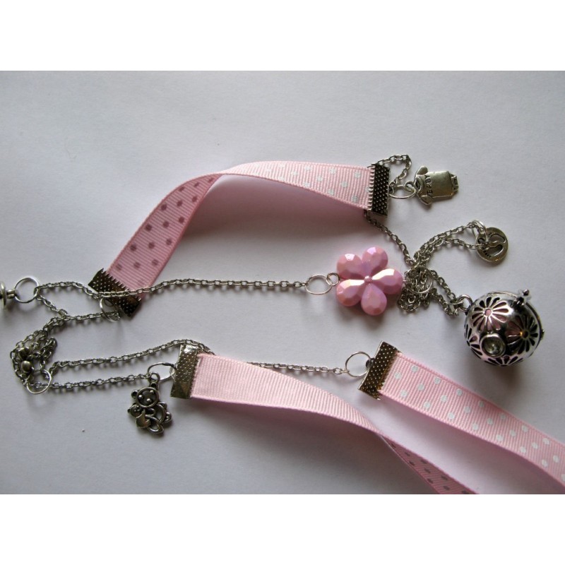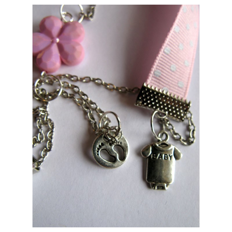 Bola de grossesse réalisé avec chaine en métal argenté, ruban, breloques en lien avec la grossesse (body, tétine, petits pieds, nounours....)